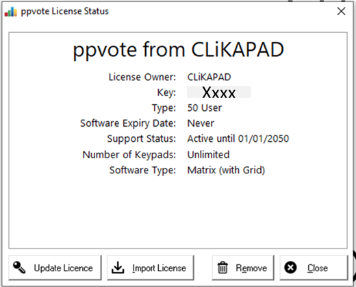 - The Key is your license number. We have obscured our key in these images but yours should be a 10 digit number. It is helpful if you supply this when contacting us for support.